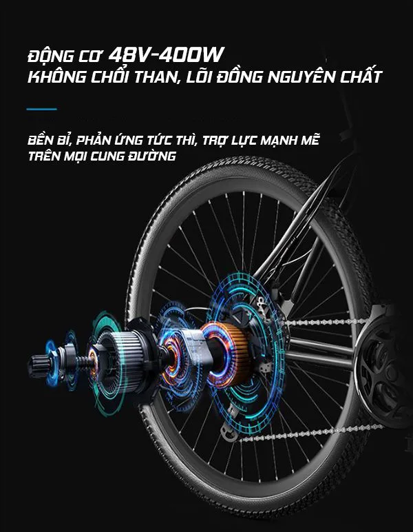 lên đến 400W, sử dụng điện áp 48V. Đây là loại động cơ đặt ở bánh sau, chạy êm,